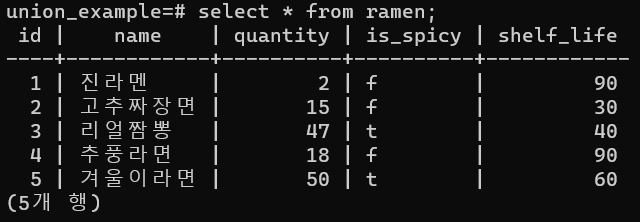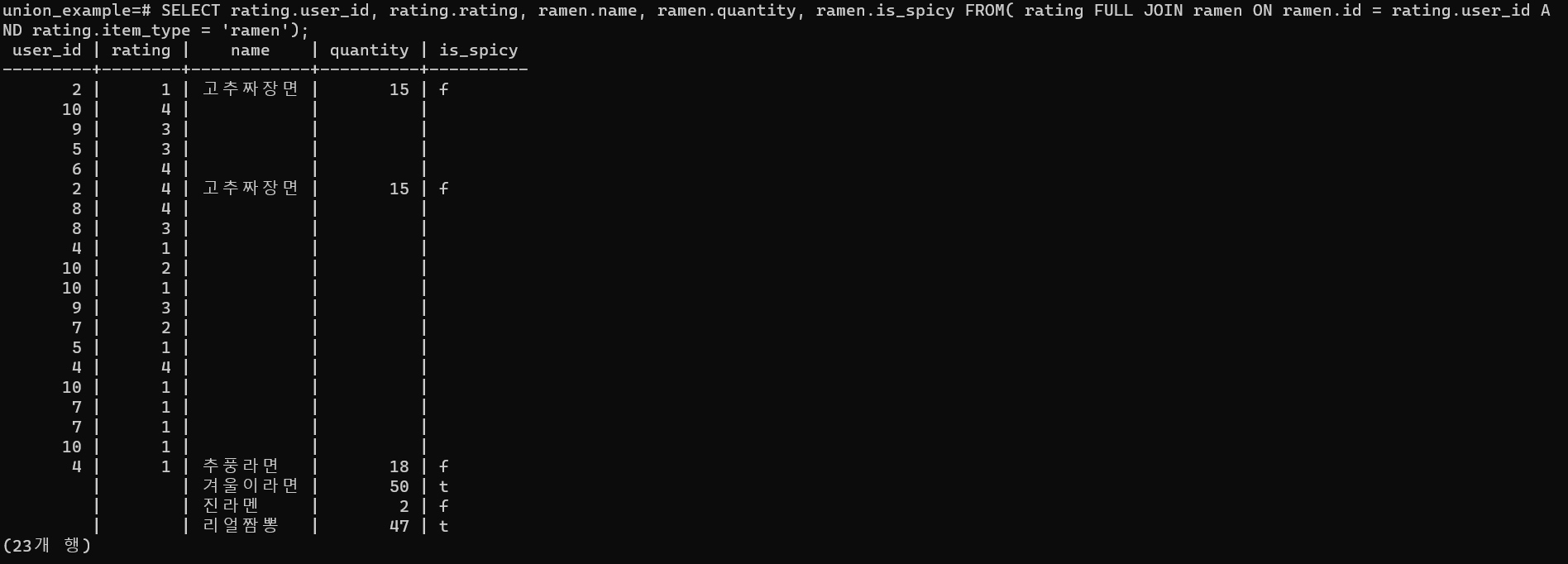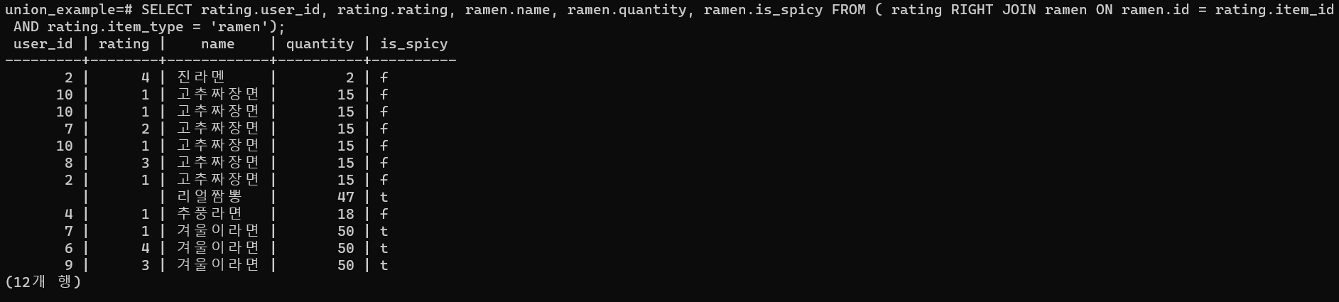 - 오른쪽 테이블(ramen)을 기준으로 왼쪽 테이블에 값이 없는 경우, null 값을 자동으로 넣어 빈 칸으로 표시한다.