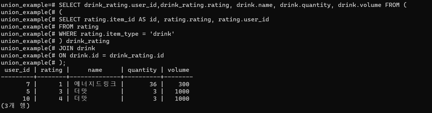 - 왼쪽 테이블(rating)을 기준으로 오른쪽 테이블에 값이 없는 경우, null 값을 자동으로 넣어 빈 칸으로 표시한다.