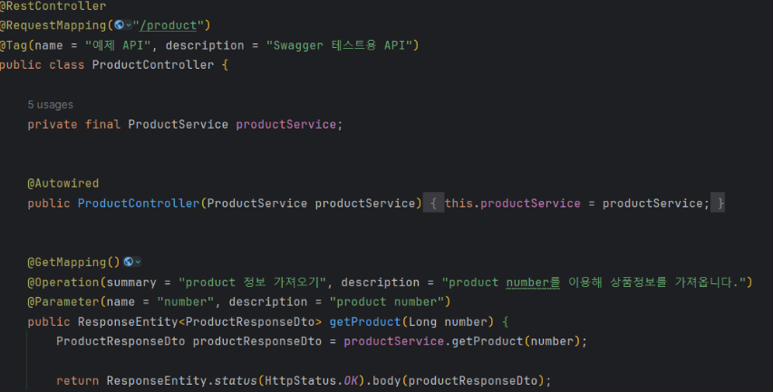 | @Parameter | @ApiImplicitParam | API 작업에서 단일 매개 변수를 나타냄 |