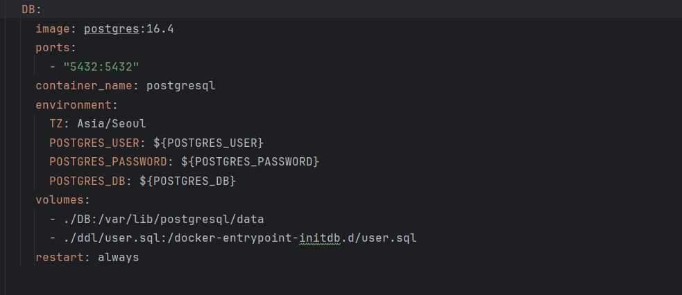 - enviroment-POSTGRES_USER: 데이터베이스 사용자를 지정해준다.