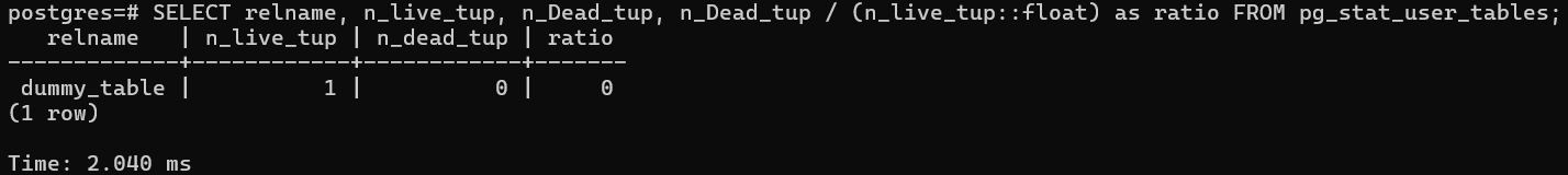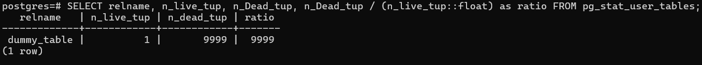 SELECT relname, n_live_tup, n_Dead_tup, n_Dead_tup / (n_live_tup::float) as ratio FROM pg_stat_user_tables;