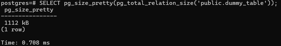 SELECT pg_size_pretty(pg_total_relation_size('public.dummy_table'));